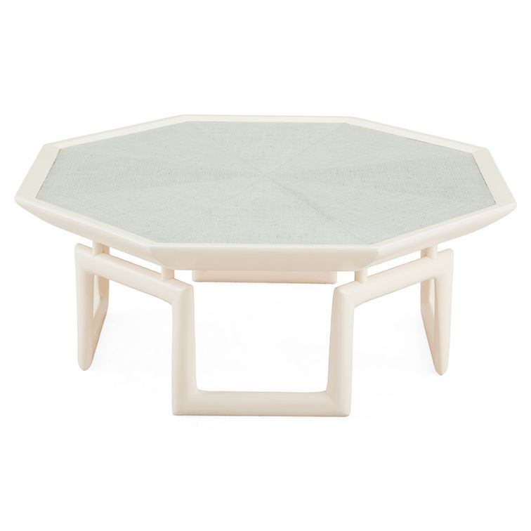Ivory lacquered mahogany frame, natural raffia, and brass.